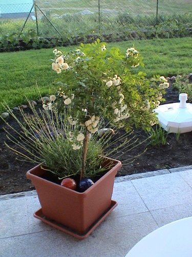 Ja, ein Stämmchen in einem Kübel zusammen mit einem ganz hellblauen (fast weißem) Lavendel. Wir haben dies zum Einzug in unser Haus bekommen. Jetzt überlegen wir, es auszupflanzen, andererseits sieht es auf der Terasse auch schön aus.