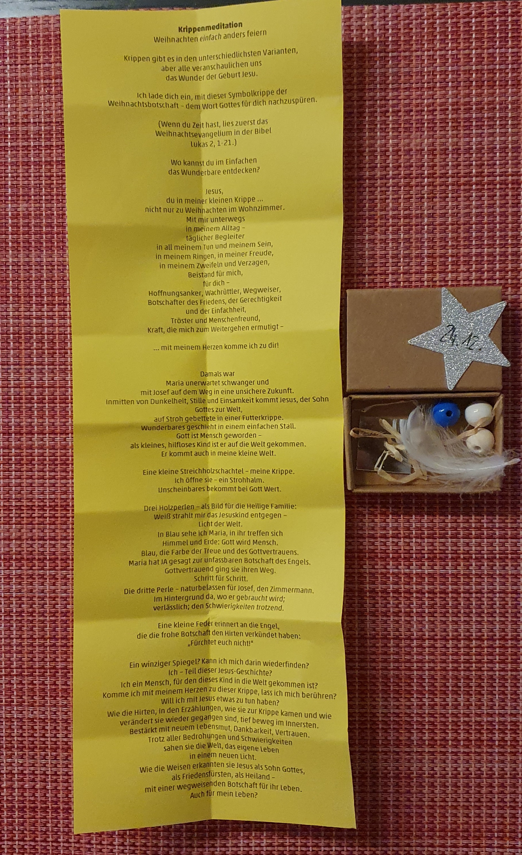Nun ist mein schöner Adventskalender zuende. In der kleinen Schachtel ist eine etwas andere Krippe. Eine Symbolkrippe, die zum Nachdenken anregen soll.