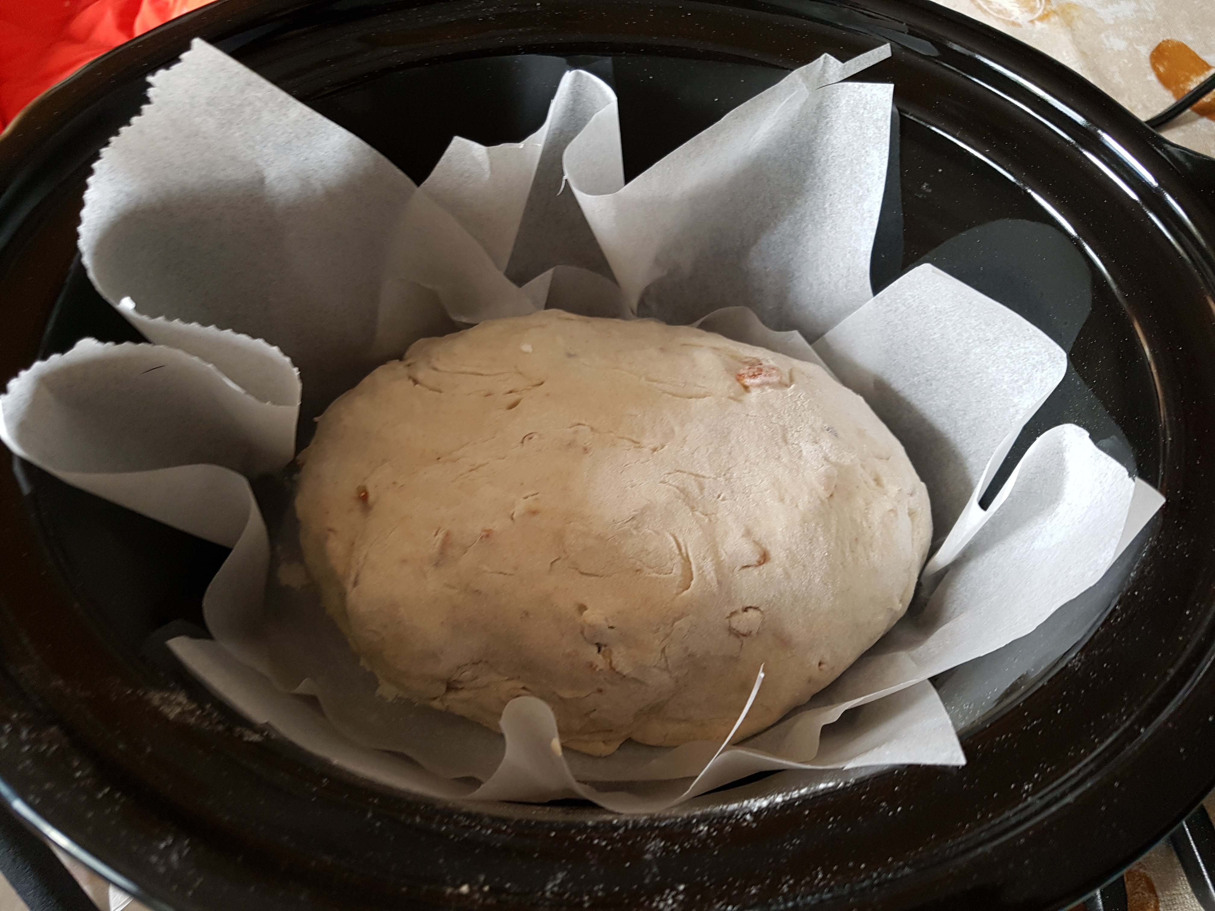 Alles in der Maschine gut verkneten, den 3,5 L Crockpot mit Backpapier auslegen, ich mach immer noch bisschen Mehl aufs Backpapier.