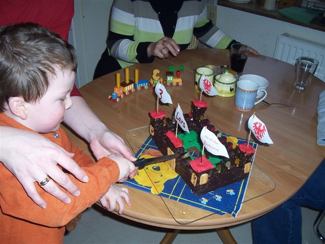 Lars hat zum zweiten Geburtstag einen Motoradkuchen gehabt - er stand so auf Motorräder. Da hab ich die Umrisse eines Motorrades von einem einfachen Rührteigblechkuchen ausgeschnitten und das Motorad mit Zuckerguss und Zuckerschrift draufgemalt.