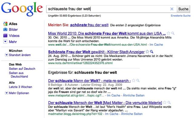 Wenn man bei Google "schlauste Frau der Welt" eingibt, versucht Google einen zu verbessern und fragt, ob man nicht eher "schönste Frau der Welt" meinte! Dass man nach der schlausten Frau der Welt sucht, scheint für Google wohl sehr abwegig zu sein.