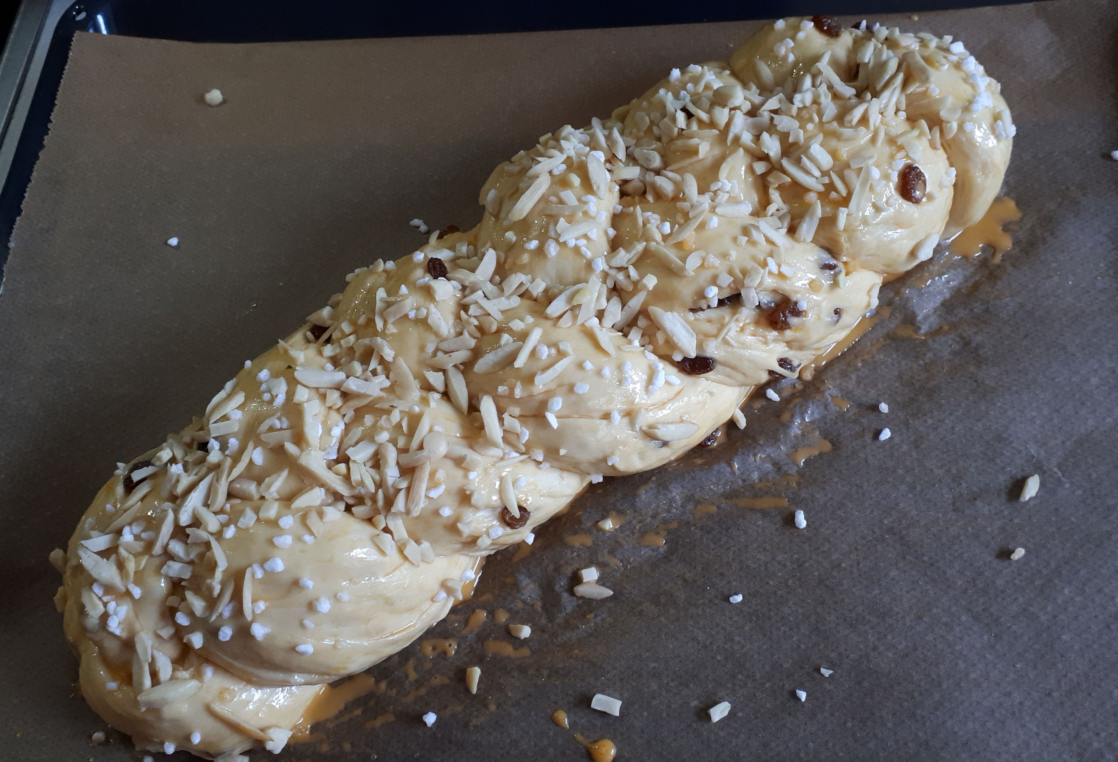 Eigelb mit 1 Essl.Milch verrühren und den Zopf damit bestreichen. Hagelzucker und Mandelstifte auf dem Zopf verteilen.