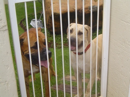 Als Tobi und ich heute morgen gefruehstueckt haben, fingen unsere Hundis auf einmal ganz aufgeregt an zu bellen. Draussen vorm Fenster waren 2 riesen Hunde. Ich tippe mal auf eine Mischung zwischen Bull-Mastiffs (oder so) und Rhodesian Ridgeback. Ich habe meine Wuffis dann erst mal "in Sicherheit gebracht" und gewartet, bis die Hunde nicht mehr in Sicht waren.