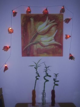 Als letztes die Lichterkette(selbstgemacht) mit dem Bild und die Vasen(Ikea) auf dem Esstisch. So eine Lichterkette ist kein Problem, die könnte ich Dir machen:) .