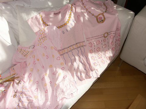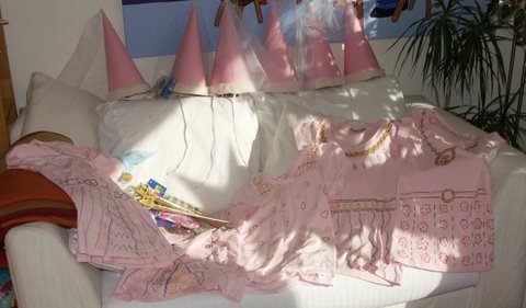 Und für die Gäste hab ich Prinzessinnenkleider besorgt, so dass alle kleinen Gäste erstmal nach Ankunft umgekleidet werden. Dank ebay hab ich diverse Kleider für 3-4 Euro ersteigert :bravo: die dann zum Geburtstag in die Verkleidungskiste wandern.