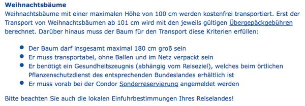 Oder wie soll man das Kleingedruckte bei Condor deuten. Und ist es nicht schon merkwürdig genug, dass es wohl Menschen gibt die mit ihrem Weihnachtsbaum verreisen, nein es kostet auch nichts extra so eine sperrige Tanne zu befördern, während jedes Kilo Übergepäck bezahlt werden muss. Ein Haken hat die Sache dann aber doch noch, euer Baum braucht ei Gesundheitszeugnis :-D