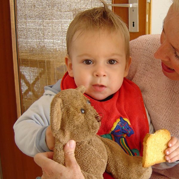 Cecilia ist verrückt nach den beiden und nuckelt am Daumen, sobald sie einen von den beiden zu packen bekommt ! Daher bekommt sie sie nur im Bett, denn tagsüber müssen die zwei ja schlafen damit sie nachts auf Cecilia aufpassen können...