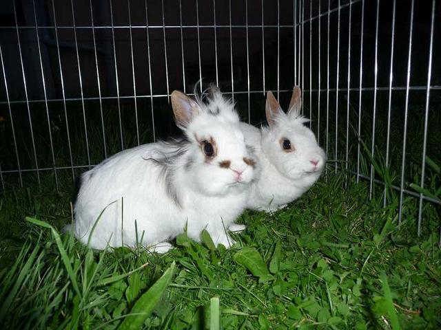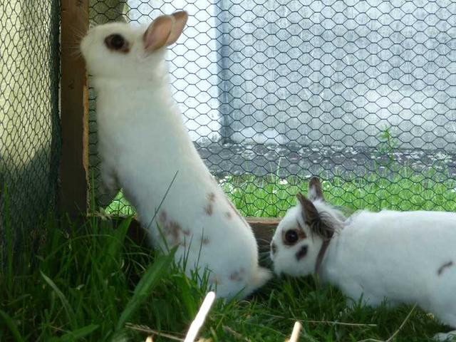 So, heute hab ich die beiden früh in den Auslauf getan, Bine (so nenn ich mal die Häsin) war anfangs gut drauf ( in ihrem Käfig!) dann aber wieder gestresst, sie lag dann schnell atmend in der Ecke........