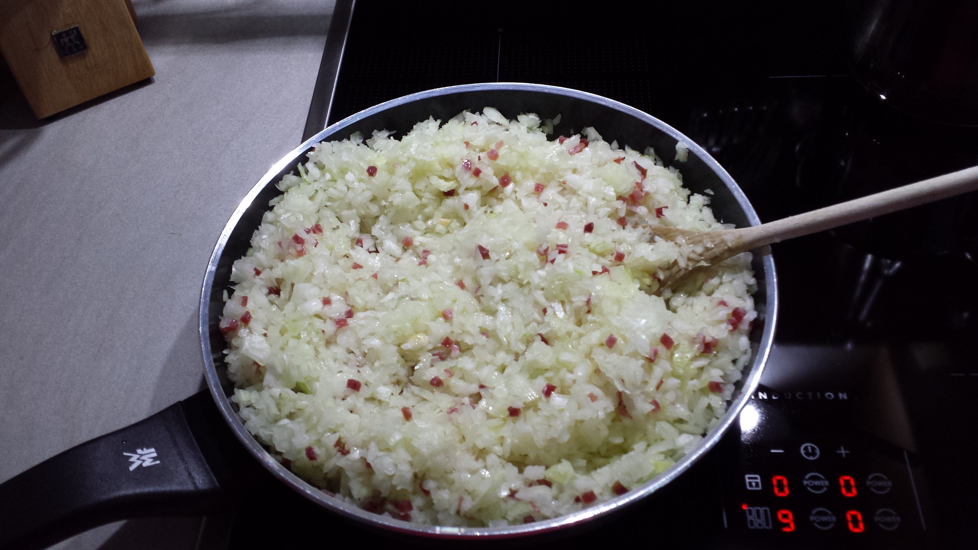 1,5 kg Zwiebeln würfeln und andünsten, danach abkühlen lassen. Am besten eignen sich Gemüsezwiebeln, da muss man nicht so viel schälen. Zum würfeln nehme ich meinen Quick Chef